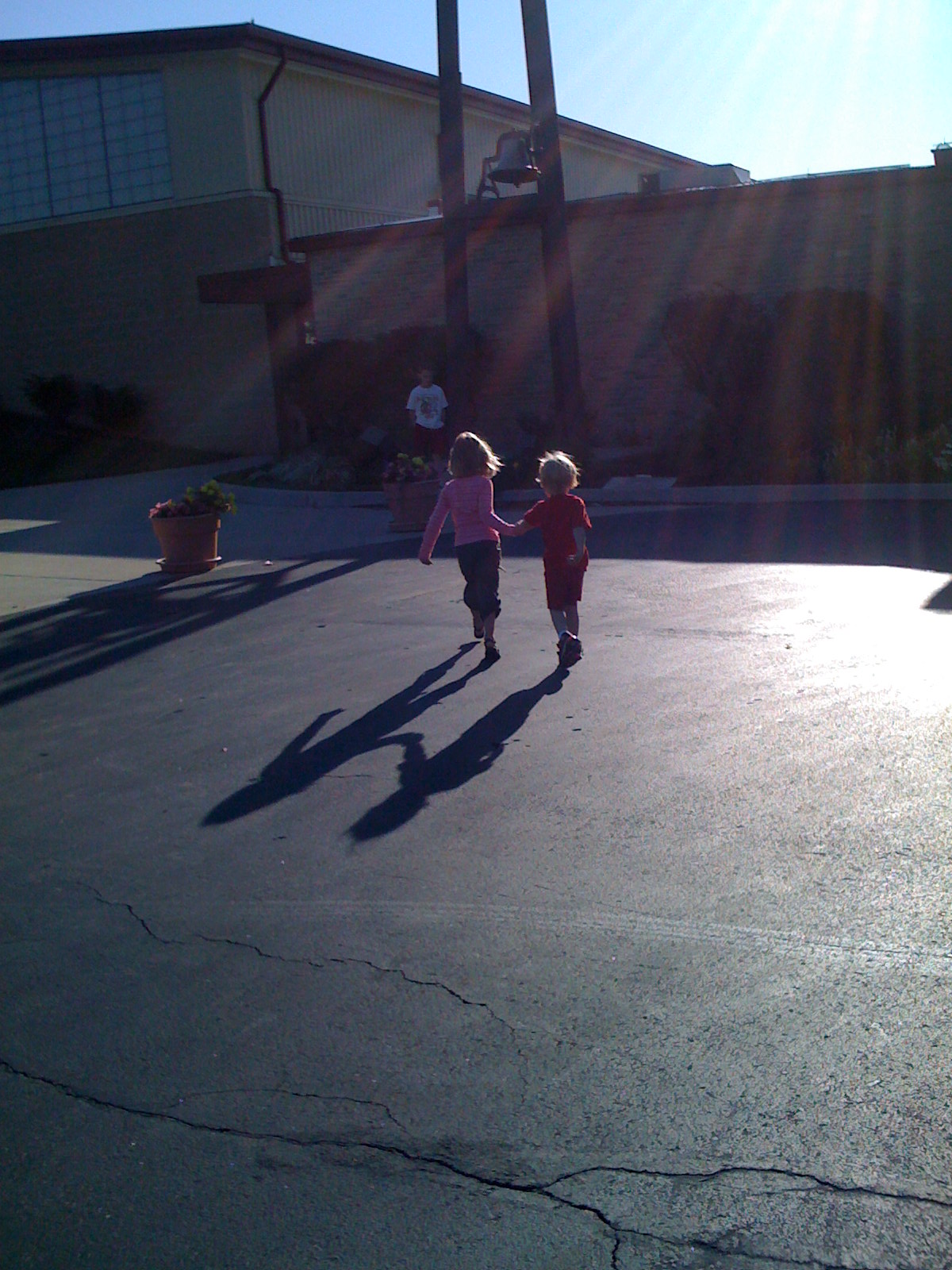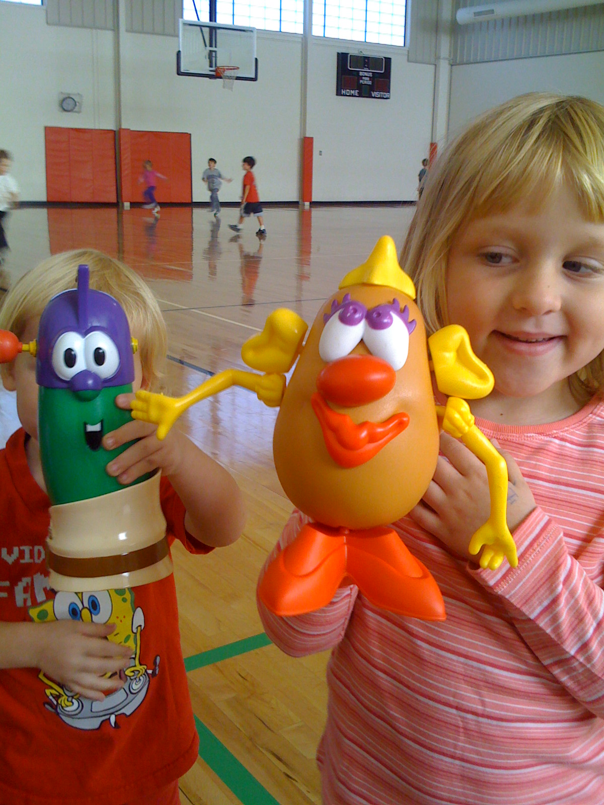 Then it was a mad dash to homeschool P.E. It warms my heart how Miss E looks after her little brother. The big issue with P.E. is always when we get there (if the kids get there early, even the preschoolers can play; note that we were NOT early) and what toys to bring. P.E. is a day to learn sharing skills. Today we learned to share Mr. Potato Head and dress-up Larry Boy. Well, maybe we didn’t really learn it but we tried.