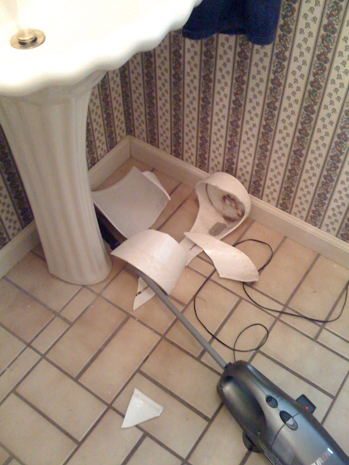 I’d saved the day but had to insist that the fortunate patient shower immediately to remove the greasy residue. He complied and just a few moments later I heard a crash. The shower door bumped into the vacuum which landed on the ceramic trash can and it was garbage. His question was, “How much do I have to pay for that?” See, I’ve been fining the kids for things they carelessly destroy. I told him this was a freebie as it wasn’t extreme negligence. It would have been hard to justify since his father destroyed another bathroom trash can last week. If he were getting an allowance from me, he would have been fined. But that was another week.