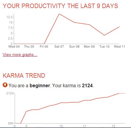 No competition aspect. Gamification is about more than just tracking performance. Often, it’s about measuring your performance against others’. Competition is very motivating for me when I feel there’s a chance I can win. So is accountability. I didn’t feel I had that, but my Karma score is 2563 after a week for anyone who cares.