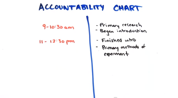 This week I’ll be testing the Accountability Chart from Sparring Mind. The day is broken up into 90-minute work periods followed by 15-minute breaks. You write down what you accomplish during each 90-minute block.