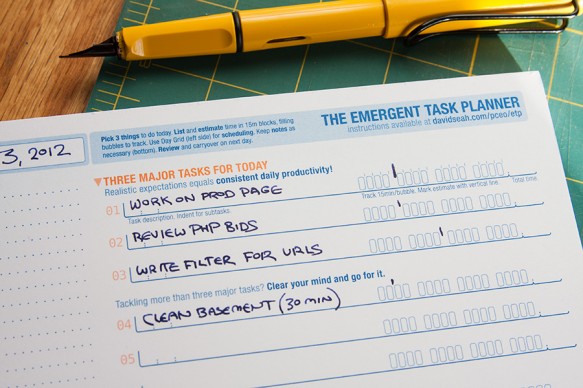This week I’ll be testing David Seah’s Emergent Task Planner. Looking at David’s recent post, I realized I had missed hearing about another approach to productivity he has been talking about since 2006. Using his paper planner, you choose 3 tasks to work on  and block out time for them. After those are complete, you can add 3 more and so on.