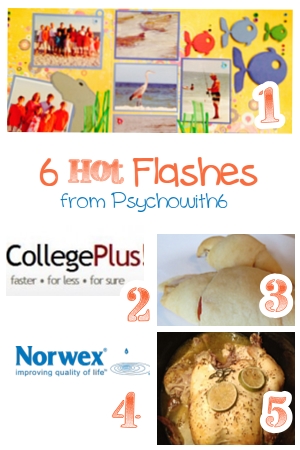 easy lunch idea, college plus review, Norwex review, Pinterest for bloggers, scrapbook kit reviewThis month’s hot flashes are in a new format similar to what I do with What’s Hot in Homeschooling. If you’re new to this series, allow me to explain that I give a detailed account of my hot flashes from the previous month. Not the wake-up-drenched or the open-the-freezer-to-cool-off-quick kind, but the hot news, reviews, and ideas I just have to share.