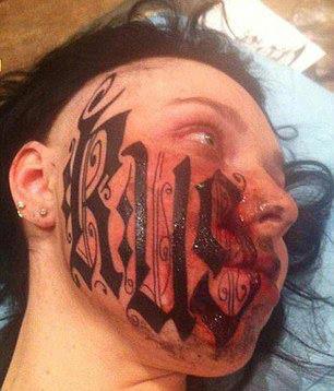 Getting Fit NOW or Never on Facebook posted this photo explaining that this young woman had allowed her boyfriend to tattoo his name on her face as a sign of her love. By the way, his name is Rus, not Bus.